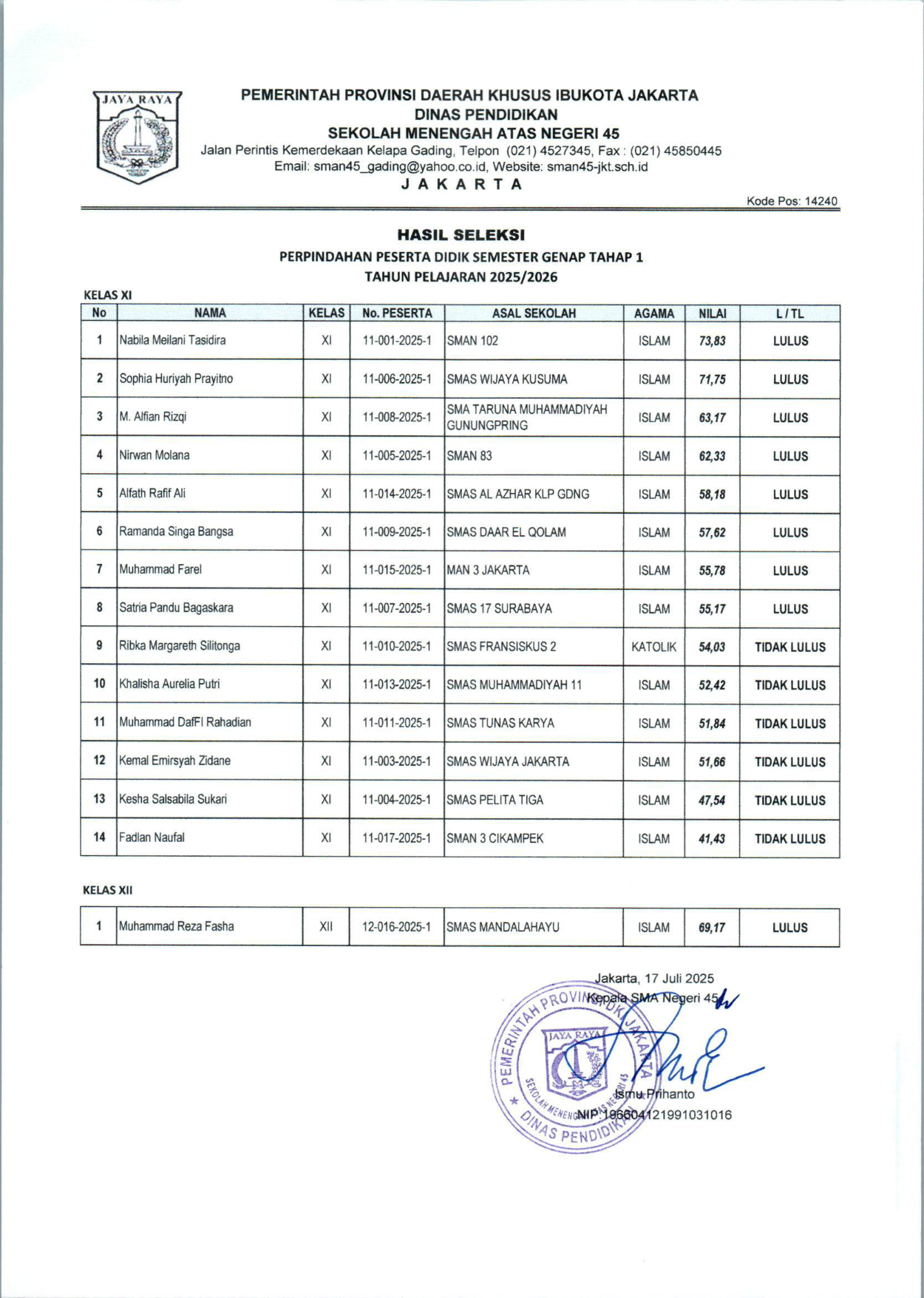 Pengumuman Hasil Test Mutasi Masuk Tahap 1 Semester Ganjil Tp. 2025-2026