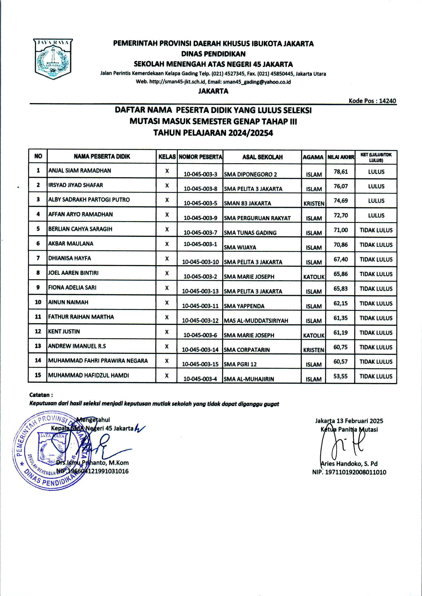 Pengumuman Hasil Test Mutasi Masuk Tahap 3 Semester Genap Tp. 2024-2025